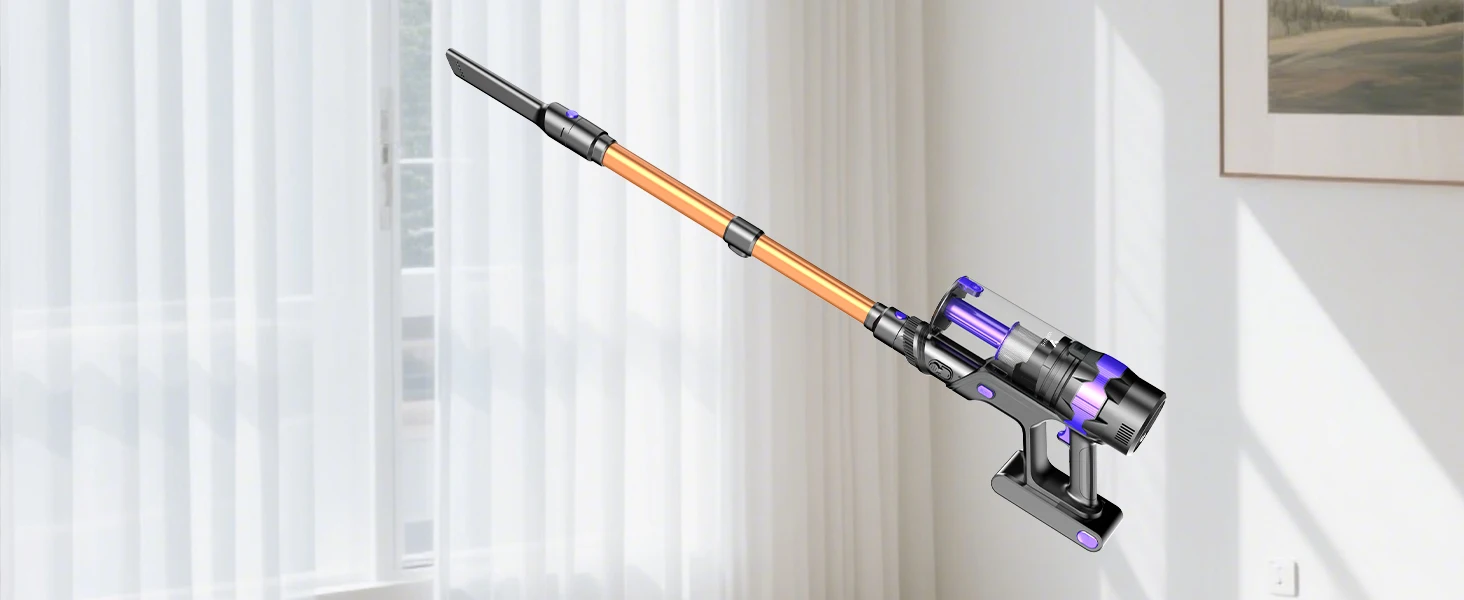 Ausgestattet mit acht 2200mAh Lithium-Ionen-Akkus bietet der V2 bis zu 60 Minuten kabellose Reinigung. Die Teleskopstange ermöglicht flexible Anpassung für Bodennähe oder höhere Flächen, während die HEPA-Filter und der 1–2L Staubbehälter für saubere Luft und hygienische Entleerung sorgen. Die spezielle Flachdüse erleichtert die Reinigung von schwer zugänglichen Stellen.